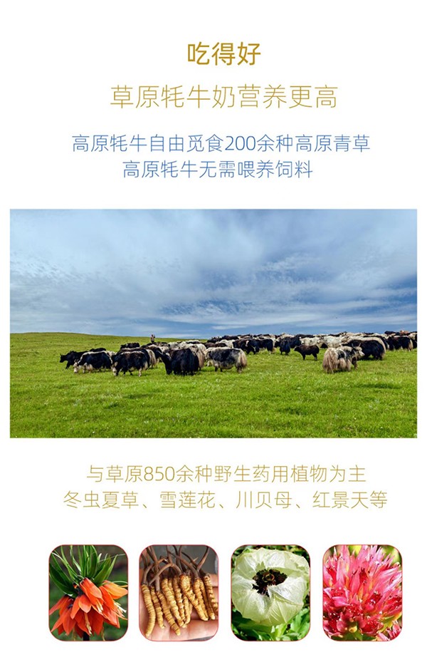 奶源來(lái)自麥洼牧場(chǎng),獲得中國(guó)、歐盟、美國(guó)三重有機(jī)認(rèn)證及國(guó)家地理標(biāo)志保護(hù)。高原牦牛奶自由覓食200余種高原青草,自然放牧,逐水草而居,吃得好,營(yíng)養(yǎng)更高。