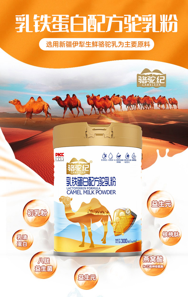 駱駝紀乳鐵蛋白配方駝乳粉,甄選優(yōu)質(zhì)奶源,選用新疆伊犁生鮮駱駝乳為主要原料,科學(xué)添加益生元、初乳粉、燕窩酸(N-乙酰神經(jīng)氨酸)、核桃肽、乳鐵蛋白及多種維生素和礦物質(zhì)、活性益生菌。采用先進工藝技術(shù)精制而成,味道香濃純正、顆粒均勻、溶解性好、口感細膩、營養(yǎng)豐富。
