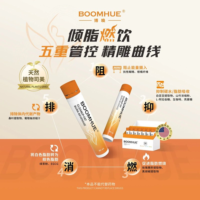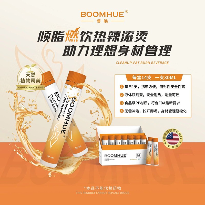 BOOMHUE博喚傾脂燃飲采用獨特的液體瓶劑型設計,告別傳統(tǒng)產(chǎn)品的瓶瓶罐罐,攜帶更方便。同時消費者無需害怕巨大的藥丸吞服體驗,只需輕輕擰開瓶蓋,即可直接飲用,無需沖泡或攪拌,口感酸甜好喝,將身材管理日常化、零食化,為身材管理帶來更輕松的選擇。