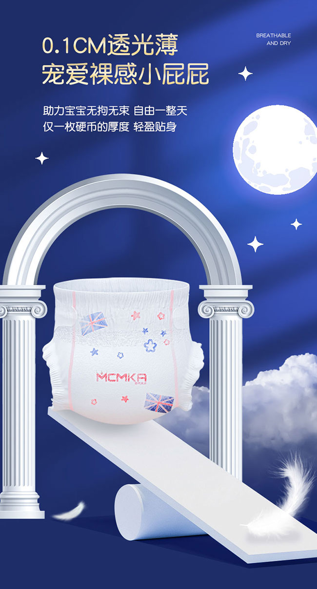 源自英國的技術(shù)加持,熱風(fēng)親膚無紡布面層像云朵輕吻肌膚,日本易艾斯纖維織就的面料細膩柔滑,減少摩擦帶來的不適。0.1cm的透光薄度,僅一枚硬幣厚度,讓寶寶仿佛帶著“裸感”自由活動,爬爬跳跳間毫無束縛。
