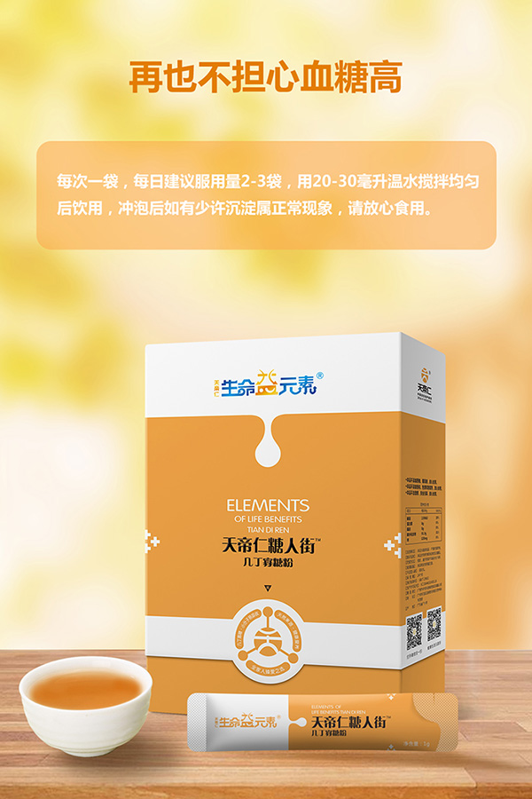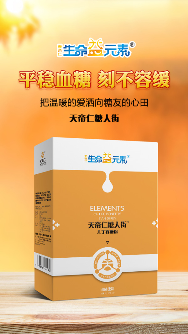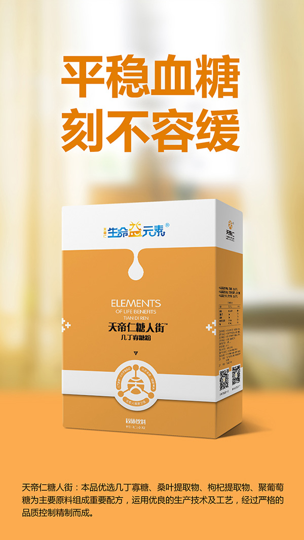 產(chǎn)品命名為“天帝仁糖人街”,傳遞出品牌對用戶生活關(guān)懷的理念。外包裝設(shè)計(jì)突出“生命元素”與“平穩(wěn)血糖 刻不容緩”等字樣,同時(shí)以“把溫暖的愛灑向糖友的心田”為情感表達(dá),強(qiáng)調(diào)品牌與用戶之間的情感聯(lián)結(jié)。整體視覺簡潔溫馨,兼具中英文標(biāo)識,符合現(xiàn)代消費(fèi)審美。