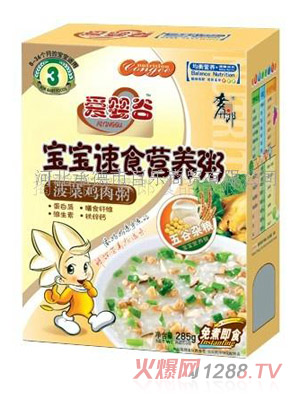 很多父母都知道菠菜中含有豐富的營(yíng)養(yǎng)物質(zhì),這些營(yíng)養(yǎng)物質(zhì)對(duì)bao--bao的健康很重要,因此父母應(yīng)給bao--bao適當(dāng)?shù)难a(bǔ)充一些菠菜。下面小編就給大家推薦一款不錯(cuò)的嬰童營(yíng)養(yǎng)輔食--愛嬰谷菠菜大骨粥。愛嬰谷菠菜大骨粥以優(yōu)質(zhì)天然菠菜和優(yōu)質(zhì)大骨為原料,同時(shí)又經(jīng)過特殊制作工藝精心制作而成,營(yíng)養(yǎng)豐富均衡,是理想的嬰童營(yíng)養(yǎng)輔食。