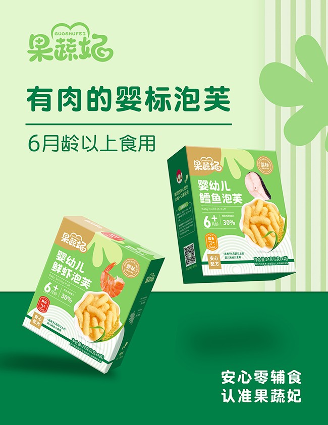 果蔬妃【嬰幼兒泡芙】是一款適合6個(gè)月以上寶寶的安心手指零食,添加30%蝦肉或鱈魚(yú)肉,強(qiáng)化鈣、維生素B1和維生素C,不添加白砂糖和食用鹽,0香精色素和防腐劑!