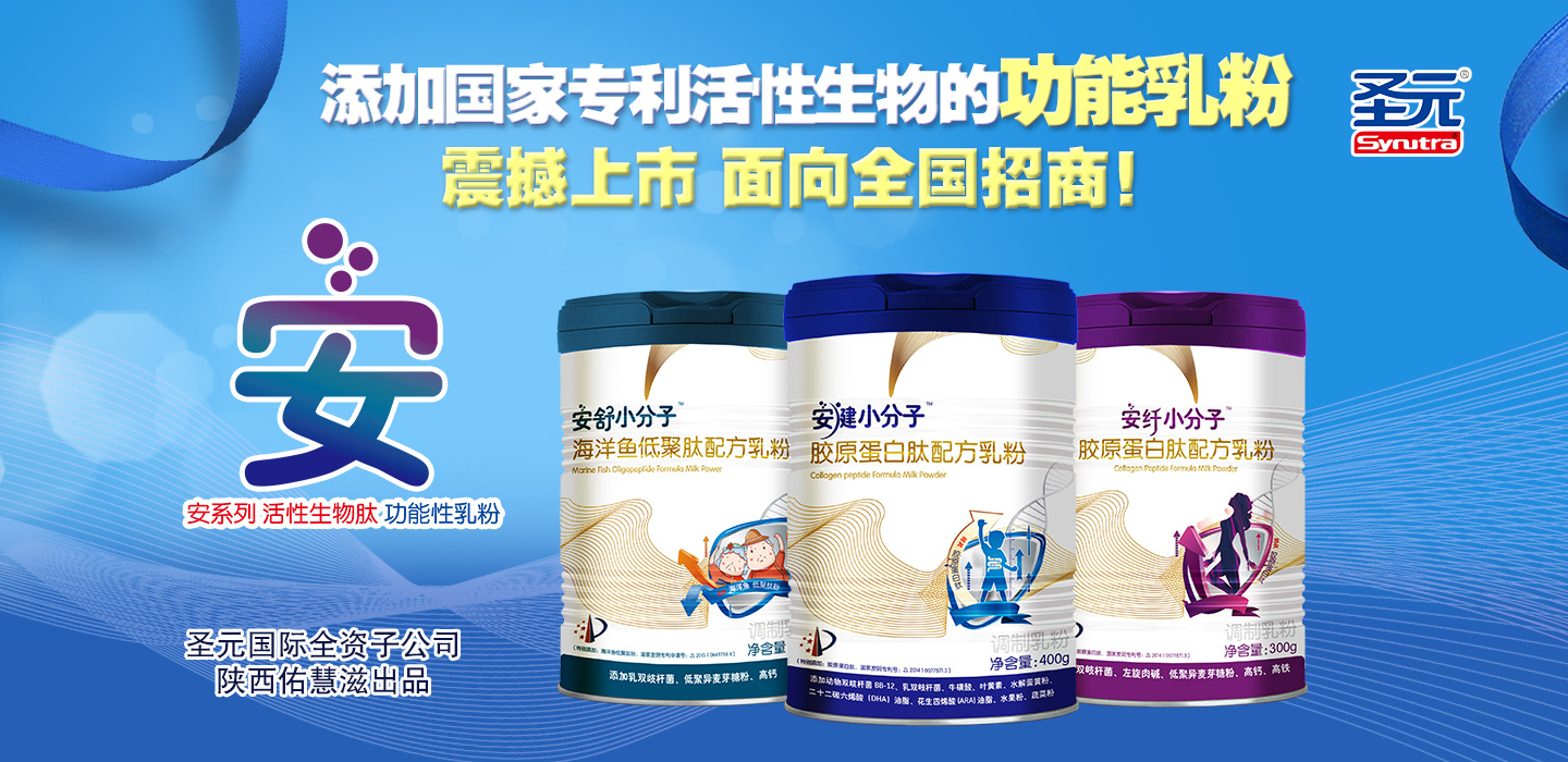 由圣元國際全資子公司陜西佑慧滋營養(yǎng)食品公司出品,由江西貝倍優(yōu)獨(dú)家運(yùn)營的“安健小分子”膠原蛋白肽配方乳粉、“安纖小分子”膠原蛋白肽配方乳粉、“安舒小分子”海洋魚低聚肽乳粉目前已經(jīng)首發(fā)上市。產(chǎn)品定位于功能性乳粉營養(yǎng)品,功能物質(zhì)添加來源于具備國家發(fā)明專利的深海鱈魚(深海無污染、無法養(yǎng)殖天然)小分子肽及低聚肽,蛋白質(zhì)含量接近100%,而脂肪含量為“0”,屬于國內(nèi)名列前茅!
