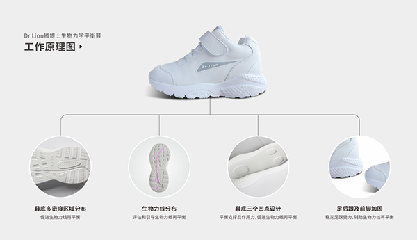 “Dr.Lion獅博士”品牌研發(fā)團隊根據(jù)青少兒不同年齡段的骨骼特征,把套餐進行了細分,分別設(shè)計了“學(xué)步鞋套餐、穩(wěn)步鞋套餐、健步鞋套餐”,為我國青少兒帶去更多專業(yè)、細致的健康管理產(chǎn)品和服務(wù)。Dr.Lion獅博士生物力學(xué)平衡鞋,主要根據(jù)生物力學(xué)原理,通過鞋底多密度區(qū)域分布,生物力線分布,寬窄分布,鞋面的側(cè)面加固,以及鞋墊的定制匹配,從力學(xué)的原理上去調(diào)整生物力線,從而使失去平衡的生物力線趨于再平衡,穩(wěn)固行走中的足踝。