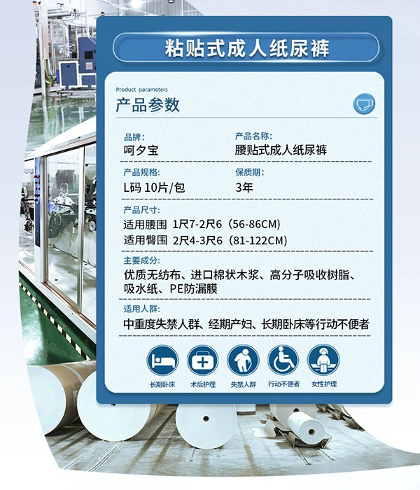 呵夕寶成人紙尿褲,產(chǎn)品具有大吸量、呵護(hù)肌膚、除臭去味等特點,同時還兼具更好的親膚性、防漏性與透氣性,保證穿起來更加舒適,穿著不會覺得悶,不懼側(cè)漏,避免尷尬。