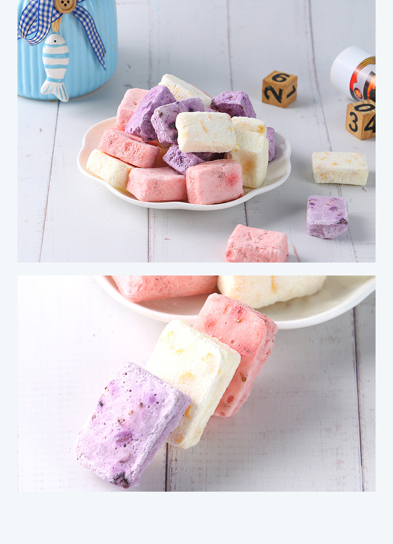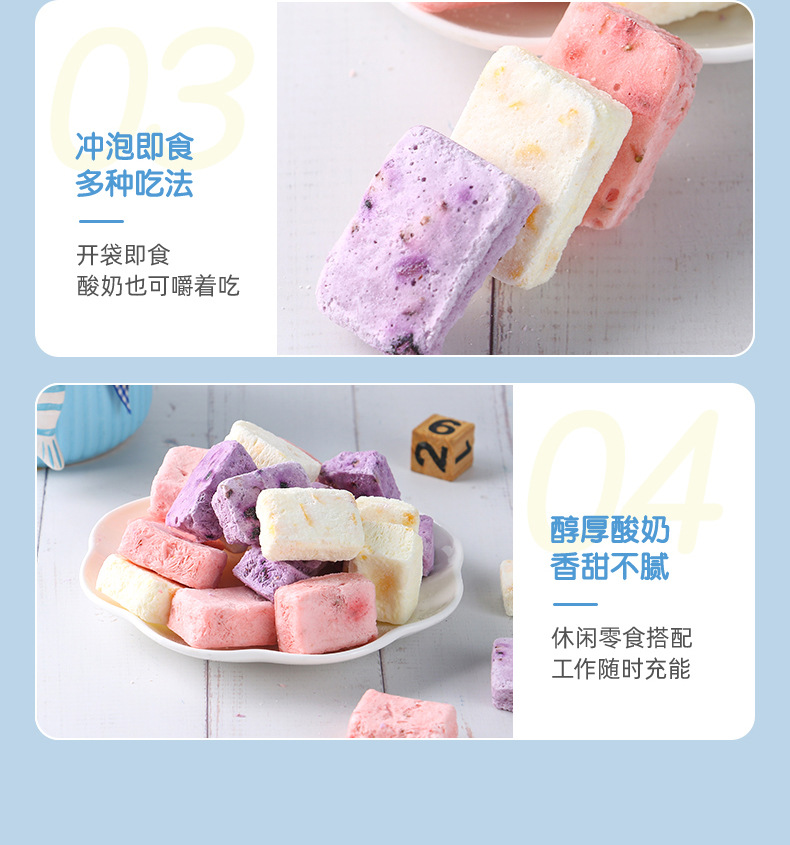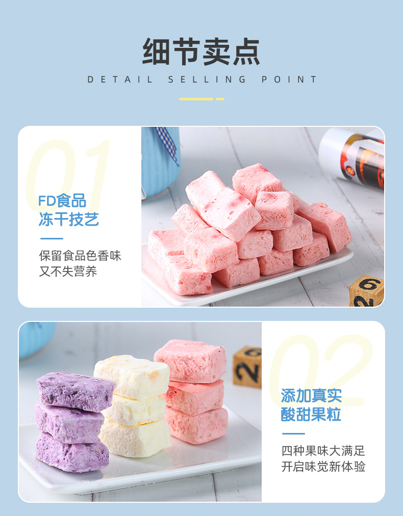 OEM貼牌水果凍干酸奶塊1/2/3克即食沖泡草莓藍(lán)莓黃桃口味定制代工產(chǎn)品展示