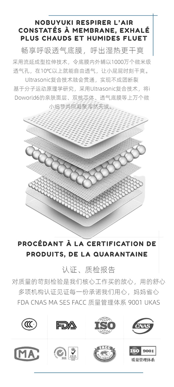 Ultrasonic復(fù)合技術(shù)融會(huì)貫通,實(shí)現(xiàn)不成團(tuán)斷裂;诜肿舆\(yùn)動(dòng)原理學(xué)研究,采用Ultrasonic復(fù)合技術(shù),將iDoworld6的親膚面層、雙核芯體、透氣底膜等上萬個(gè)微小細(xì)節(jié)共同凝聚渾然夭成。